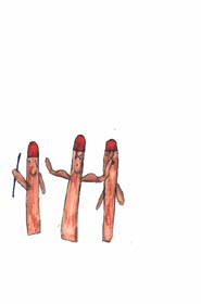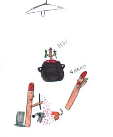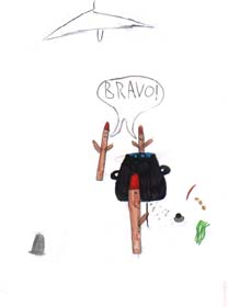 | "Pourquoi suis-je si peureuse?", gémit la première allumette. "S'il te plaît, toi qui es scientifique, pourquoi n'inventerais-tu pas une potion anti-peureuse?" - "Cela va être dur! Il me faudra un poil, 3 miettes, 1 g de terre et 5 brins d'herbe." "Ca ne a pas être aussi dur que cela", dit la magicienne, et d'un coup de baguette magique elle fit apparaître un poil, 3 miettes, 1 g de terre et 5 brins d'herbe. "Bravo!" dirent en choeur la peureuse et la scientifique. | ![]() |