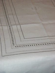 Cette nappe faisait partie de son trousseau lorsqu'elle épousa, en 1875, Pierre Fore : c'est ainsi qu'on peut lire le chiffre "FP", Fore-Pirjantz, brodé sur cette nappe de ... 4 mètres sur 2 : on avait de grandes tables dans les grandes familles lyonnaises!